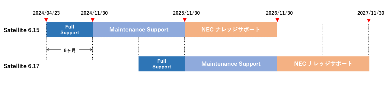 - Red Hat Satellite は Full Support が 6ヶ月、Maintenance Support が 1年の合計 1年6ヶ月がサポート期間となります。