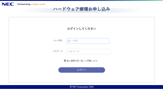 - 修理該当製品に紐づく、サポートIDのユーザIDとパスワードを入力してください。