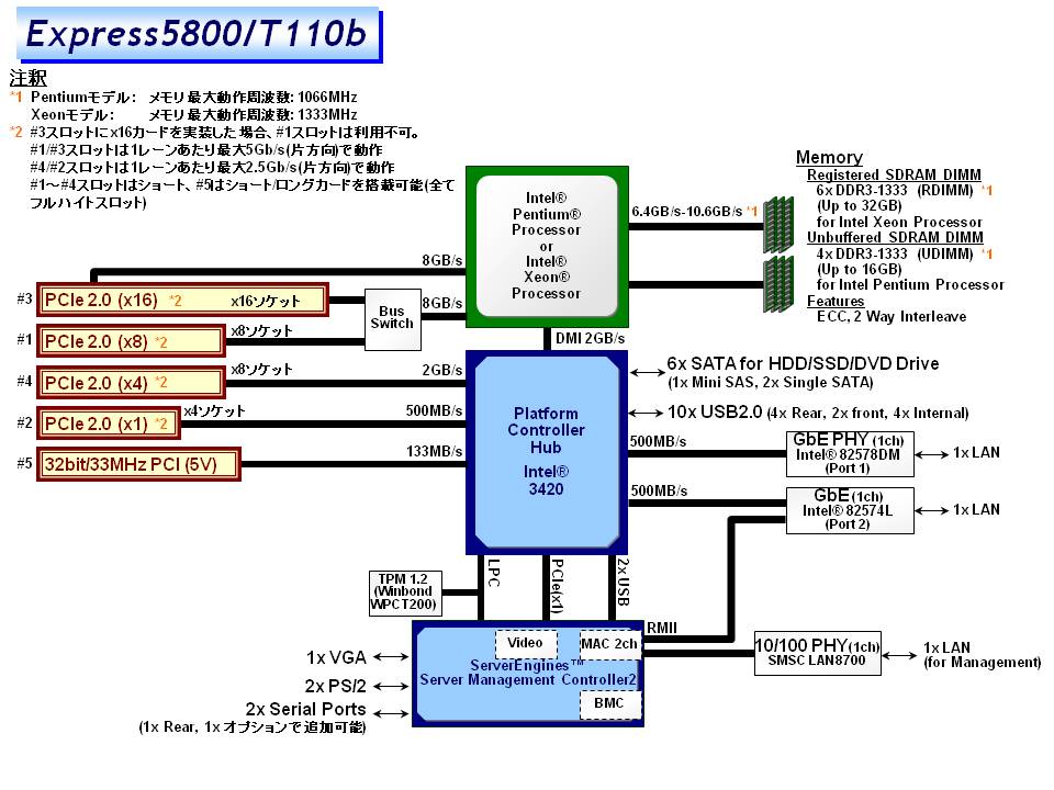 x16レーンを持つスロットにx16カードを搭載した場合、x8レーンを持つスロットは利用不可 全てFull Height, PCI EXPRESSスロットはショートサイズ, PCIスロットはロングサイズ |