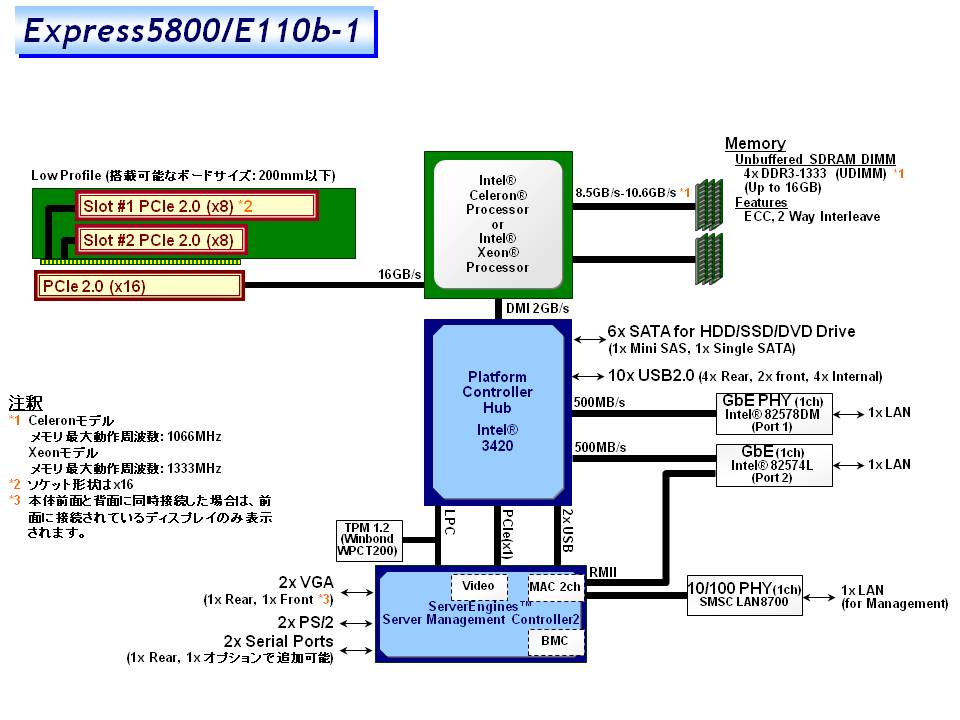 1x PCI EXPRESS 2.0 (x8レーン, x16ソケット) + 1x PCI EXPRESS 2.0 (x8レーン, x8ソケット) (ロープロファイル、200mmサイズ) |