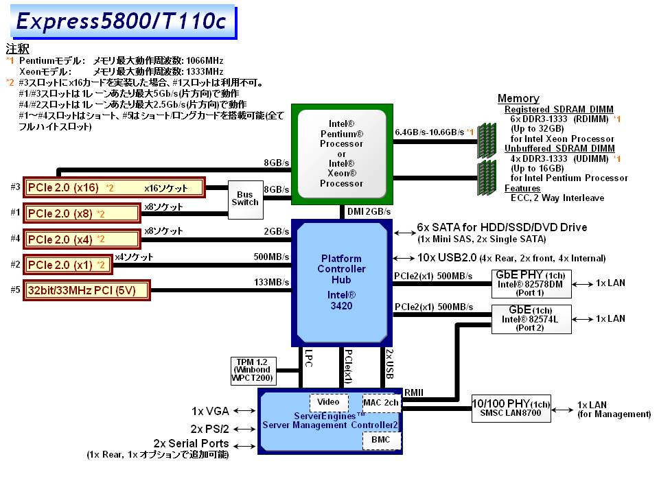 x16レーンを持つスロットにx16カードを搭載した場合、x8レーンを持つスロットは利用不可 全てFull Height, PCI EXPRESSスロットはショートサイズ, PCIスロットはロングサイズ |