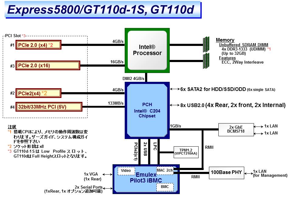 3.5型HDD : SATA 12TB (4x3TB) 2.5型HDD : SATA 4TB (4x 1TB), SAS 1.2TB (4x 300GB) 2.5型SSD : 400GB (4x 100GB) (2.5型HDD/SSDを搭載する場合はオプションHDDケージの手配必要) |