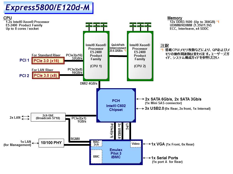 | 3x USB2.0 (2x 前面、1x 内部),1x シリアルポート (RS-232C規格準拠/D-Sub9ピン, シリアルポートA, 1x背面) 2x 1000BASE-T LANコネクタ (1000BASE-T/100BASE-TX/10BASE-T対応, RJ-45, 2x 背面) 1x マネージメント専用LANコネクタ (100BASE-TX/10BASE-T対応, RJ-45, 1x 背面) |