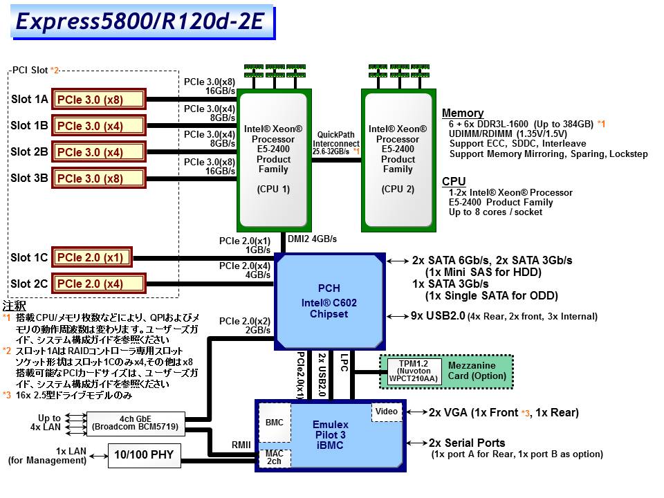 SATA 3, 6Gb/s : RAID 0/1/10(標準), RAID 5/6/50/60 (オプション), SAS 6Gb/s : RAID 0/1/5/6/10/50/60 (オプション) |