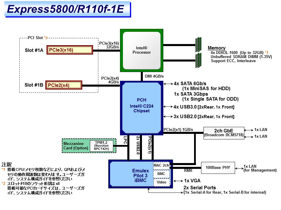 SATA 6Gb/s: RAID 0/1/10(標準), RAID 5/6/50/60 (オプション) SAS 6Gb/s : RAID 0/1/5/6/10/50/60 (オプション) |