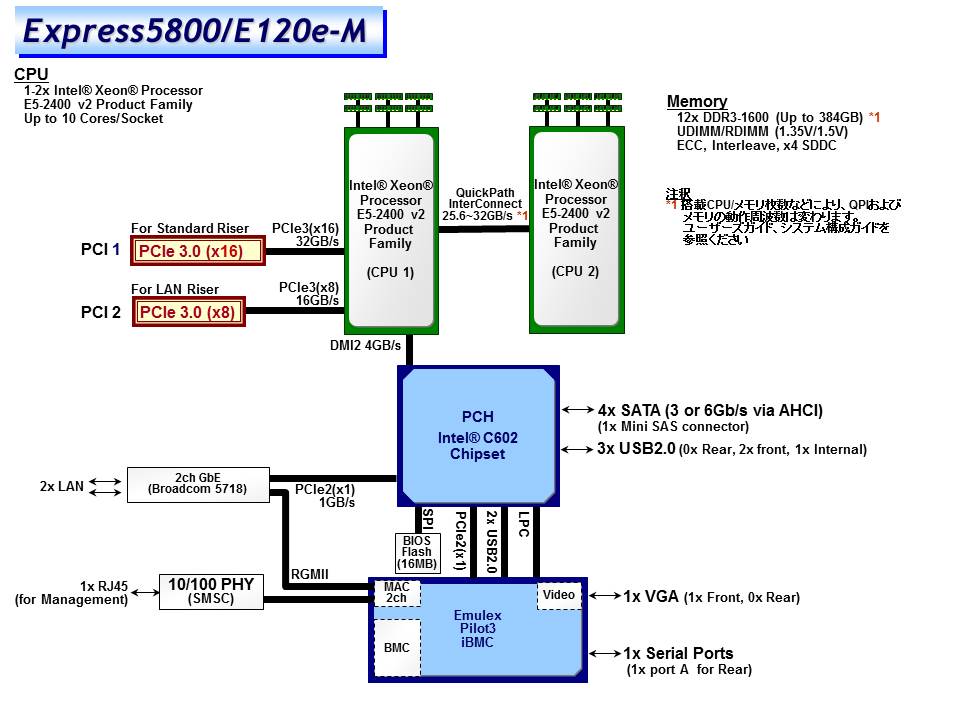 標準搭載なし(セレクタブルオプション) / Unbuffered DIMM : 96GB (12x 8GB), Registered DIMM : 384GB (12x 32GB) |