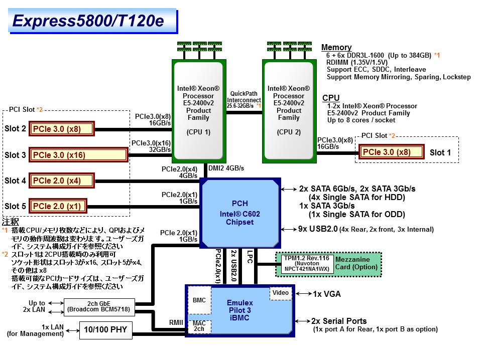 1x PCI Express 3.0 (x16レーン, x16ソケット) (フルハイト、300mm以下) 2x PCI Express 3.0 (x8レーン, x8ソケット) (フルハイト、300mm以下) (1CPU構成時は1スロットのみ使用可能) 1x PCI Express 2.0 (x4レーン, x8ソケット) (フルハイト、300mm以下) 1x PCI Express 2.0 (x1レーン, x4ソケット) (フルハイト、300mm以下) |