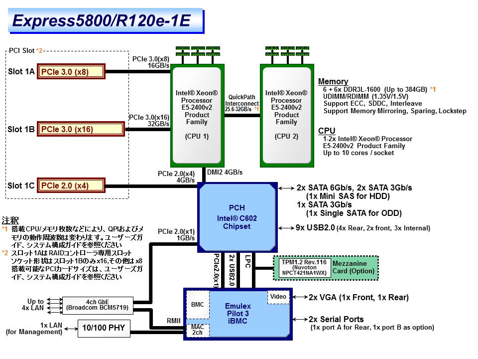 標準搭載なし(セレクタブルオプション) / Unbuffered DIMM : 48GB (12x 4GB), Registered DIMM : 384GB (12x 32GB) |