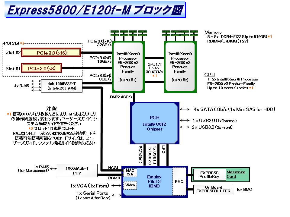 | 2x USB3.0 (2x 前面(TypeA))*3、1xUSB2.0 (1x 内部(Box 10pin)), 1x シリアルポート (RS-232C規格準拠/D-Sub9ピン, シリアルポートA, 1x背面) 4x 1000BASE-T LANコネクタ (1000BASE-T/100BASE-TX/10BASE-T対応, RJ-45, 4x 背面) 1x マネージメント専用LANコネクタ (1000BASE-T/100BASE-TX/10BASE-T対応, RJ-45, 1x 背面) |