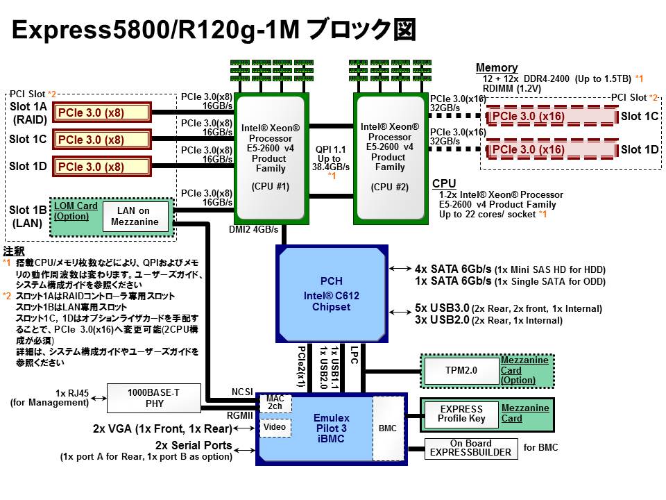 1x PCI Express 3.0 (x8レーン, x8ソケット) (フルハイト、220mmサイズ) 1x PCI Express 3.0 (x8レーン, x8ソケット) (ロープロファイル、220mmサイズ) 1x PCI Express 3.0 (x8レーン, x8ソケット) (RAIDコントローラ専用) 1x PCI Express 3.0 (x8レーン, x8ソケット) (LOMカード専用) (オプションのライザカード手配で、PCI Express 3.0(x16レーン, x16ソケット)に変更が可能) |