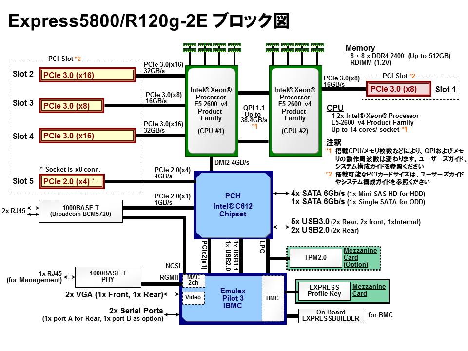 標準搭載なし(セレクタブルオプション) / Registered DIMM : 512GB (16x 32GB), TSV Registered DIMM : 1TB (16x 64GB) |