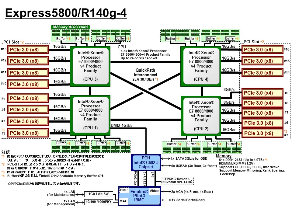 14x PCI Express 3.0 (x8レーン, x8ソケット) (ロープロファイル、167.6mmサイズ) 2x PCI Express 3.0 (x4レーン, x8ソケット) (ロープロファイル、167.6mmサイズ) |
