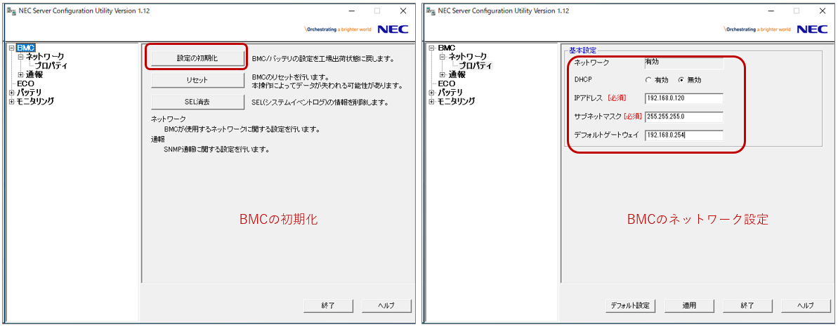 | ② | Server Configuration UtilityにてBMCを初期化してすべての設定情報をクリア |