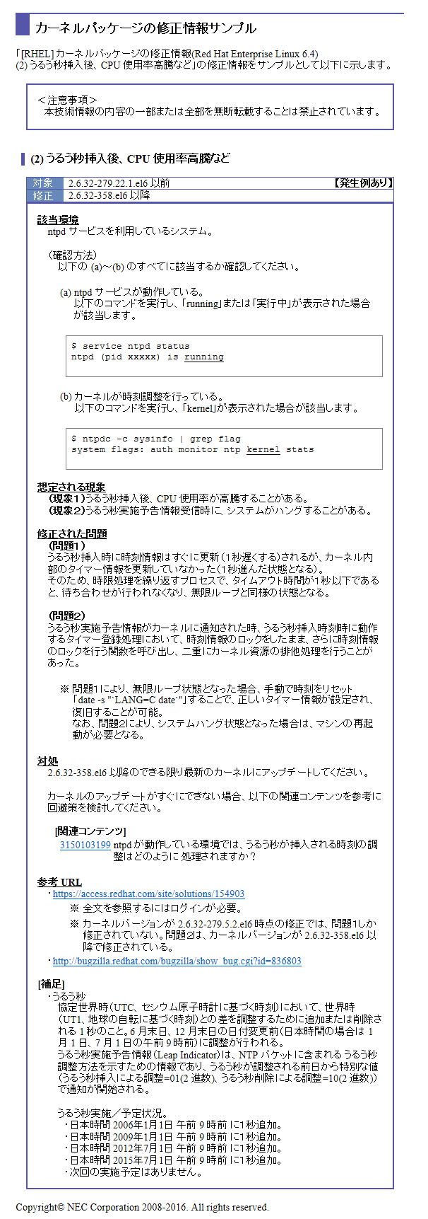 | ※ | 修正情報(修正情報一覧のリンク先)の参照は、Linux拡張サービスセット、LinuxサービスセットRHEL-EX-をご契約のお客様限定(特典サービス)となっております。