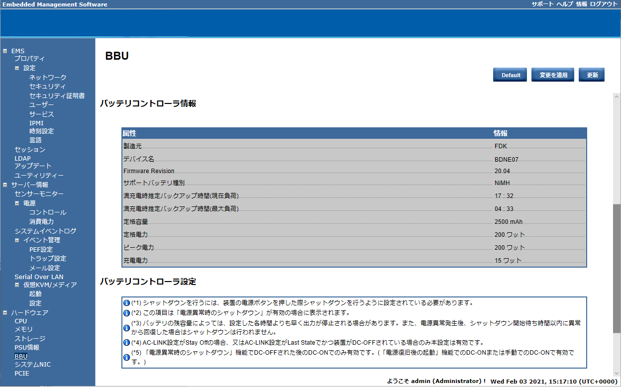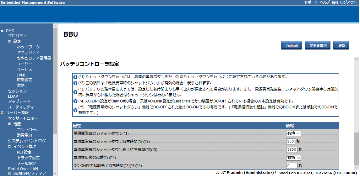 内蔵バッテリは、電源ユニットから出力された直流電源が異常な場合に電力を供給されるようになっているため、商用電源だけでなく電源ユニットの異常にも対応することができます。通常、BMC Webインタフェースより内蔵バッテリの設定を変更することなく、既定の設定のまま運用することができます。